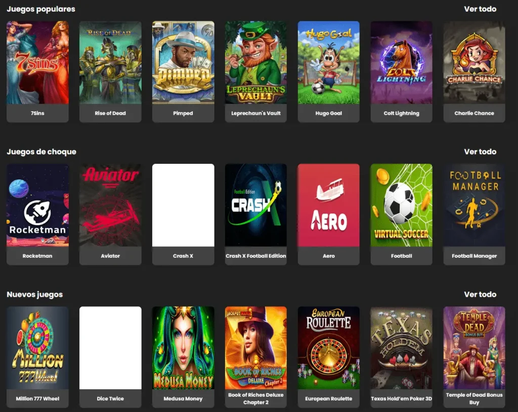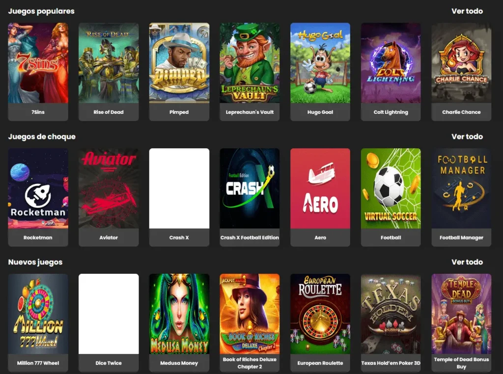Los juegos de crash también están disponibles, incluyendo el popular Aviator de Spribe. Entre los juegos más populares se encuentran Diamond 7’s Explosion, Egyptian Sun y Ramses Book.