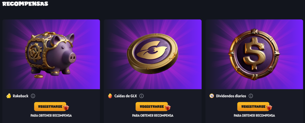 | 🎁 Bonos y Promociones | Potenciadores únicos, sistema de Rakeback, recompensas GLX |