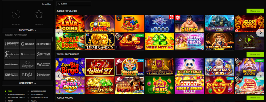 WinWin Casino combina un diseño moderno y funcional, con colores oscuros y acentos en dorado que resaltan la marca.