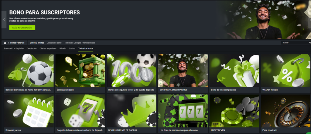WinWin Casino ofrece múltiples bonos y promociones, tanto para juegos de casino como para apuestas deportivas.